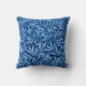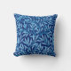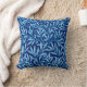 Throw pillow in a William Morris Art Nouveau textile pattern of stylised willow branches and leaves in shades of light sky blue, accented with white, on a dark cobalt / navy blue background