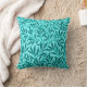 Throw pillow in a William Morris Art Nouveau textile pattern of stylised willow branches and leaves in shades of turquoise / teal on a light aqua background