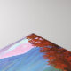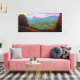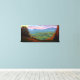 This is a canvas print of an original Matthew Gauvin Landscape painting. The oil painting depicts the view from the top of Burke Mountain in East burke Vermont looking out over Burke at Mount Pisgah, Mount Hor and Willoughby Lake in Westmore Vermont. The painting is thick brush strokes of warm greens and blues with splashes of warmer colours like orange, yellow and pink making the whole thing vibrate with the warm energy of the time just before foliage season. Rolling foreground hills at the top of Burke lead the viewers eye down into burke up and around the mountains and into the distant lake Willoughby.