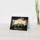 Dramatic black gives a new attitude to the standard thank you card! This pretty lemon yellow, tangerine gold, and green floral arrangement has dashes of colour added, including red, violet, and blue. It looks stunning on a black background. Light gold script text at the bottom says Thank You! The inside of this card is left blank for your own personal message.