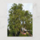 Evergreen willow tree against the clear sky. Willow tree in garden with various blossoming plants and a small house