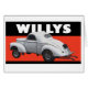 Digitally reworked image of a 1941 Willys drag racer on background of red and black with large white word 'WILLYS'.