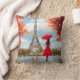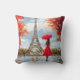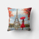 A graceful woman with a red umbrella strolls towards the Eiffel Tower in a soft autumn breeze. Romantic Parisian charm in glowing red and gold tones.