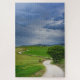 Jigsaw puzzle of a photograph of a winding white dirt road (strada bianca) through the rolling green hills of Val d'Orcia valley landscape in Tuscany, Italy under dark clouds in the sky.