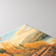 A vibrant autumn landscape. A long, winding train track curves through a forest ablaze with golden and orange foliage. The train itself is a classic, vintage-style locomotive with multiple carriages. In the foreground, a small lake reflects the autumn colours and the train's passage. The overall scene evokes a sense of tranquillity and the beauty of nature.