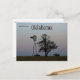 This postcard features a silhouette of an old windmill standing beside an old tree in an Oklahoma country field at sunset.