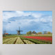 Poster print of a landscape with a windmill and yellow and red tulips under a cloudy sky in the Dutch countryside on a beautiful springtime day in the Bulb Region, the Netherlands.