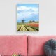 Vertical canvas landscape print with a windmill and yellow and red tulips under a cloudy sky in the Dutch countryside on a beautiful springtime day in the Bulb Region, the Netherlands.