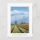 Vertical postcard of a landscape with a windmill and yellow and red tulips under a cloudy sky in the Dutch countryside on a beautiful springtime day in the Bulb Region, the Netherlands with a white border and the text: 'Netherlands'.