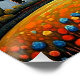 A.I. created print of a colourful windmill stands amidst rolling fields as a winding path leads through the lush landscape beneath the surreal sky and the setting sun.