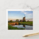Postcard of a windmill next to a small ditch with a bridge at the edge of a big meadow in the dutch countryside at sunset in Aarlanderveen, the Netherlands.