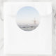 Round photo sticker with a windmill in the snow next to a canal during a foggy sunrise in winter in the Netherlands