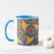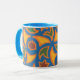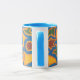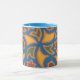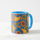 A white mug with a blue handle and rim, decorated with a geometric screenprinted desing of windmills.