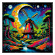 A.I .created print of underneath a surreal psychedelic sky filled with a variety of celestial bodies, a vibrant windmill is surrounded by a landscape of lush, jungle vegetation reflected in an adjacent body of water.