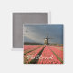 Souvenir photo magnet of a landscape with a windmill and pink tulip flowers in rows on a bulb farm under a grey sky in the countryside in the Netherlands in spring with the text 'Holland'.