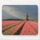 Mousepad with a landscape with a windmill and pink tulip flowers in rows on a bulb farm under a grey sky in the countryside in the Netherlands in spring.