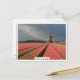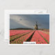 Postcard of a landscape with a windmill and pink tulip flowers in rows on a bulb farm under a grey sky in the countryside in the Netherlands in spring with a white edge and in black the text 'Holland'.