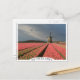 Postcard of a landscape with a windmill and pink tulip flowers in rows on a bulb farm under a grey sky in the countryside in the Netherlands in spring with a white edge and the text 'Netherlands'.