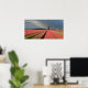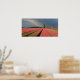 Poster print of a landscape with a windmill and pink tulip flowers in rows on a bulb farm under a gray sky in the countryside in the Netherlands in spring. Great decoration on your wall!