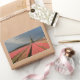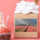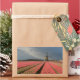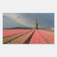 Rectangular photo sticker of a landscape with a windmill and pink tulip flowers in rows on a bulb farm under a grey sky in the countryside in the Netherlands in spring.