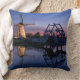 Throw pillow with two illuminated windmills and a drawbridge with reflection in the water of the canal in the last light at sunset in Kinderdijk in the Netherlands.