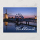Postcard of two illuminated windmills and a drawbridge with reflection in the water of the canal in the last light at sunset in Kinderdijk in the Netherlands with the text: 'Holland'.