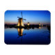 Rectangular souvenir photo magnet of historic windmills illuminated at dusk during the Blue Hour with reflection in the water in a landscape in Kinderdijk, the Netherlands.