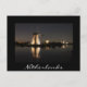 Postcard of a landscape with multiple windmills, illuminated at night, with reflection in the still canal water in Kinderdijk, the Netherlands with a black border and the text: 'Netherlands'.