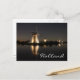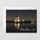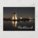 Postcard of a landscape with multiple windmills, illuminated at night, with reflection in the still canal water in Kinderdijk, the Netherlands with the text: 'Holland'.