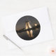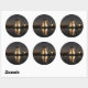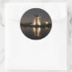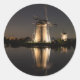 Round photo sticker of a landscape with multiple windmills, illuminated at night, with reflection in the still canal water in Kinderdijk, the Netherlands.