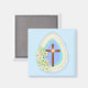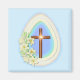 Glowing wooden Cross is framed with white Lillies and window egg to symbolise rebirth. The background is a lovely aqua shade. A lovely symbolic religious design.