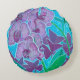 Round throw pillow featuring hand drawn floral painting, indoor garden - beautiful orchid flower, triangle leaves of oxalis and some succulents on background. Colour palette: purple, violet, lilac, lavender, teal, green and blue colours