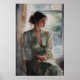 A beautiful young woman is depicted seated by a window, her gaze tinged with sadness,