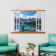 Create a tranquil atmosphere with this beautiful window view lake and mountains wall tapestry. Would look great in a windowless room or office.