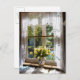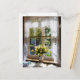 Window with lace curtain and tulips postcard