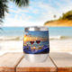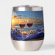 An image of wine on the beach at sunset, featuring a beautiful wine tumbler to keep your drink cool while enjoying the outdoors. A lovely and thoughtful wine gift.