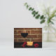 This artist trading card features a simple image of a glass of wine, a plate of cheese and three red flowers against a rustic red brick wall.
