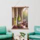 Wall tapestry with beautiful illustration of a bottle of wine and a glass of wine surrounded by red grapes.