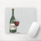 green bottle of wine with quote on label with glass of red wine on textured gray background