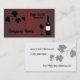 A wine bottle and wine glass in silhouette in the lower right corner with a grape vine with leaves in silhouette in the upper left corner with a gradient red to dark red background. The back of the card has the grape vine and leaves in a softer tone against a white background.