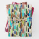 Wrapping paper in a wine bottle pattern: earth colours of brown, rust and tan with accents of turquoise and blue against a neutral, beige background - plum, rose, eggplant and mauve with cream against a burgundy wine background - and earth colours with accents of peach, cream and rust against a terracotta / rust background