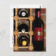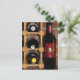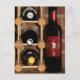 This colourful postcard features a simple still life of one upright bottle of wine next to three more bottles in a wooden wine rack. A rustic brick wall background completes the composition.
