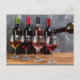 A hand pours red wine into a glass, with a row of wine bottles in the background.