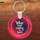 Round button keychain features fun text "Wine cause adulting is hard" surrounded by red neon circles on a dark background. Keychains make memorable gifts for family and friends or create one for yourself.