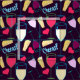 Party themed modern graphic wine glasses, cheese & hearts Fabric design on a dark burgundy background. Perfect cute design for crafting products for an upcoming celebration.