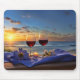 Glasses of wine on the beach as the sun sets—a serene scene adorned with candles and flowers.