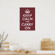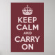 Dark wine red background with lighter pink design in a modern version of the classic "Keep Calm and Carry On" design.