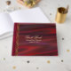 Elegant burgundy coloured wedding guest book done in a satin look, with graphics of gold tone jewel encrusted edging. Personalise the custom text, on the front of the book, for your special day.
