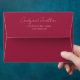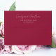 Wine red coloured mailing envelope for your wedding invitations and features your name and address printed on back flap in a modern script style. Personalise your envelope by editing and replacing name and address with your own. Edit further to change font style or colour. Select your envelope size that fits your invitation.