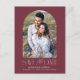 Announce your wedding date in style with our modern photo save the date postcard. The simple save the date postcard features your engagement photo inside of a wine-coloured arch frame. "Save the Date" is displayed in white modern serif and script fonts. Personalise the front of the save the date by adding your names, wedding date, and wedding location. The postcard reverses to display your return address and wedding details.